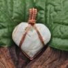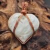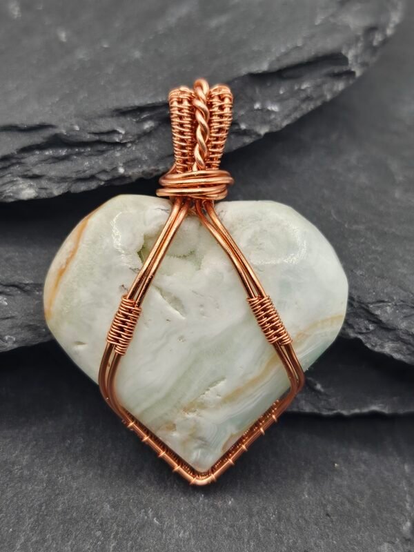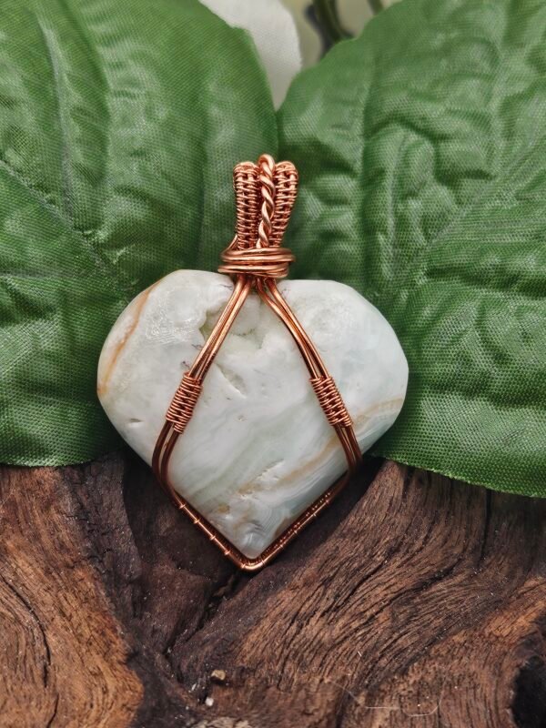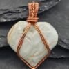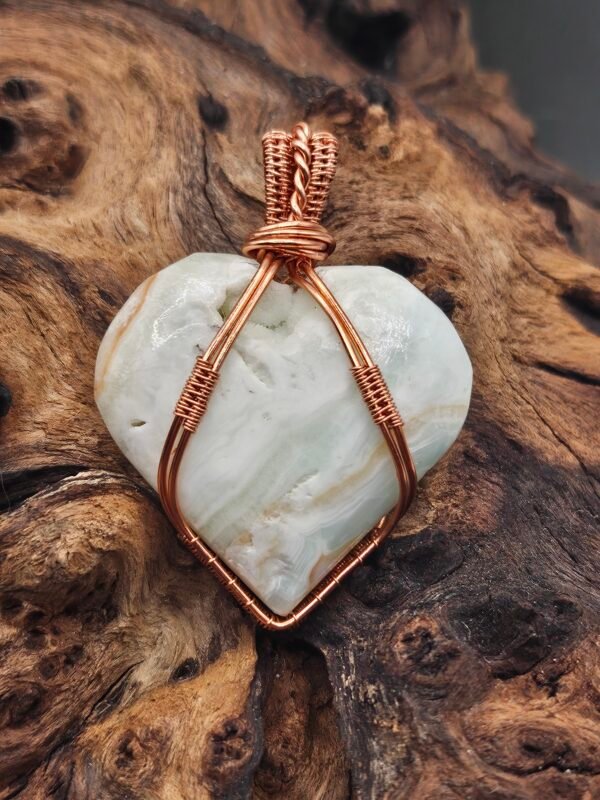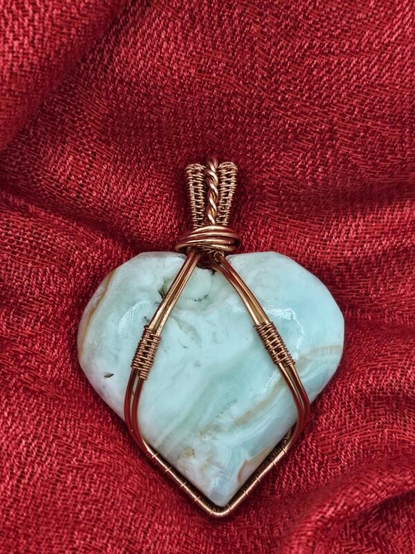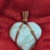 One of a kind Caribbean blue calcite heart pendant, expertly wrapped in handwoven coated copper wire. Flame woven bezel. Chunky woven bail with copper twisted accent for added security while wearing. Leather necklace included with purchase of each pendent.