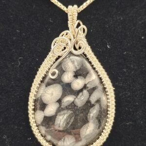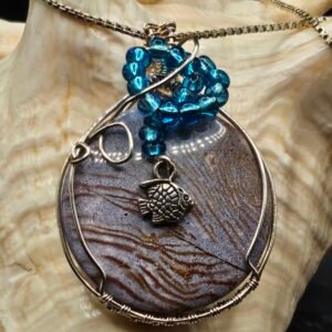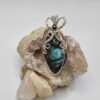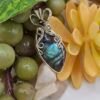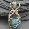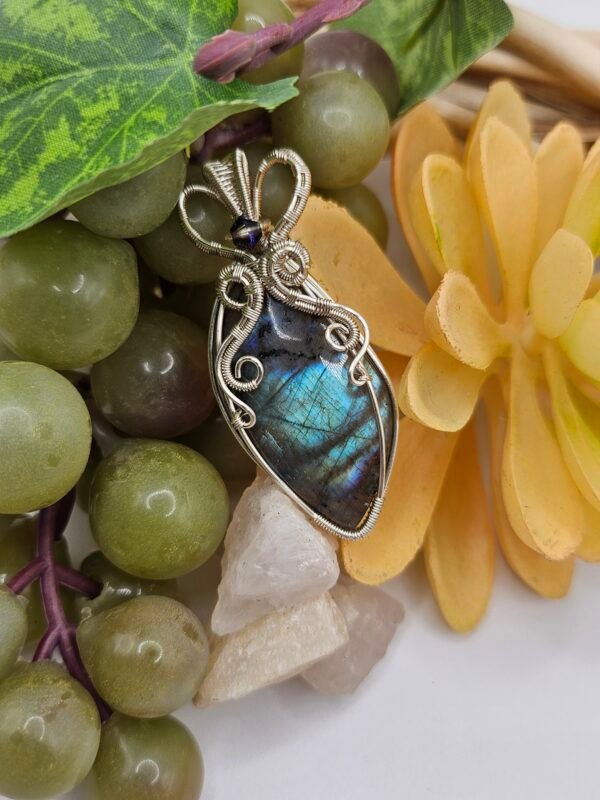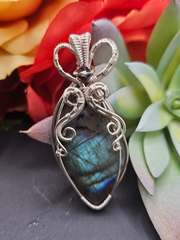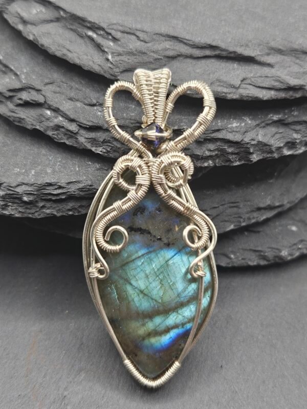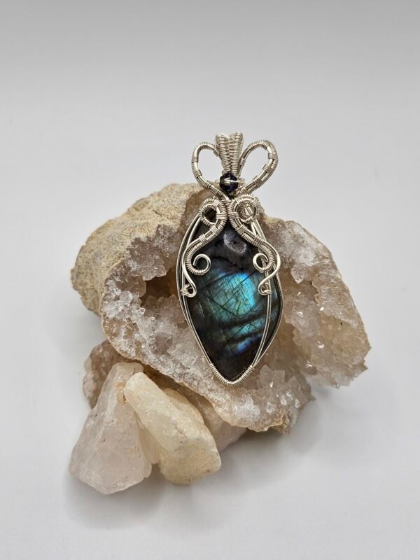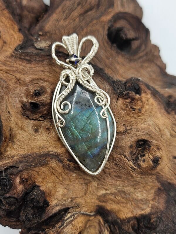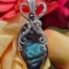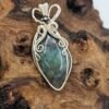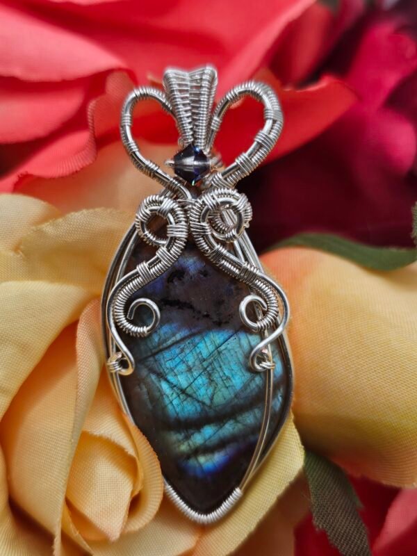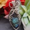 One of a kind labradorite pendant, expertly wrapped in handwoven silver coated copper wire. Accented with black iridescent Swarovski crystal. Sturdy woven bail for added security while wearing. Leather necklace included with purchase of each pendent.